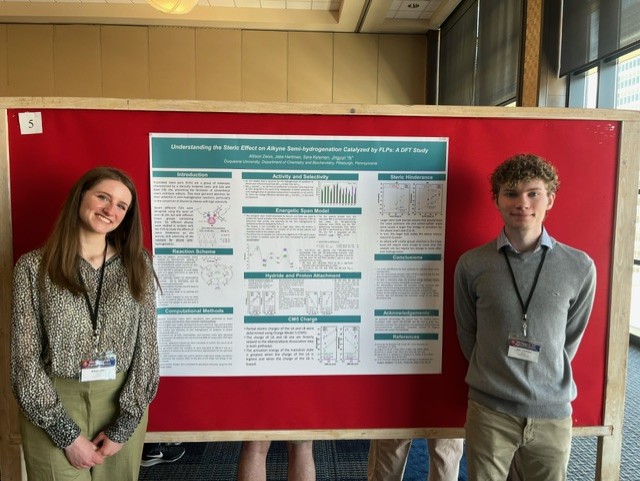 Undergraduate students Allison and Jake in Ye Research Group presented their computational work "Understanding the Steric Effect on Alkyne Semi-hydrogenation Catalyzed by FLPs: A DFT Study" at 36th Annual ACS Regional Symposium, Pittsburgh. Excellent jobs!